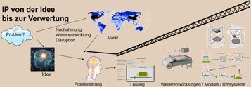 Begleitphase >> | Kreation Neues schaffen | Ausübungsfreiheit Freedom to operate | Schutz IP anmelden | Verwertung Nutzung in die Wege leiten |